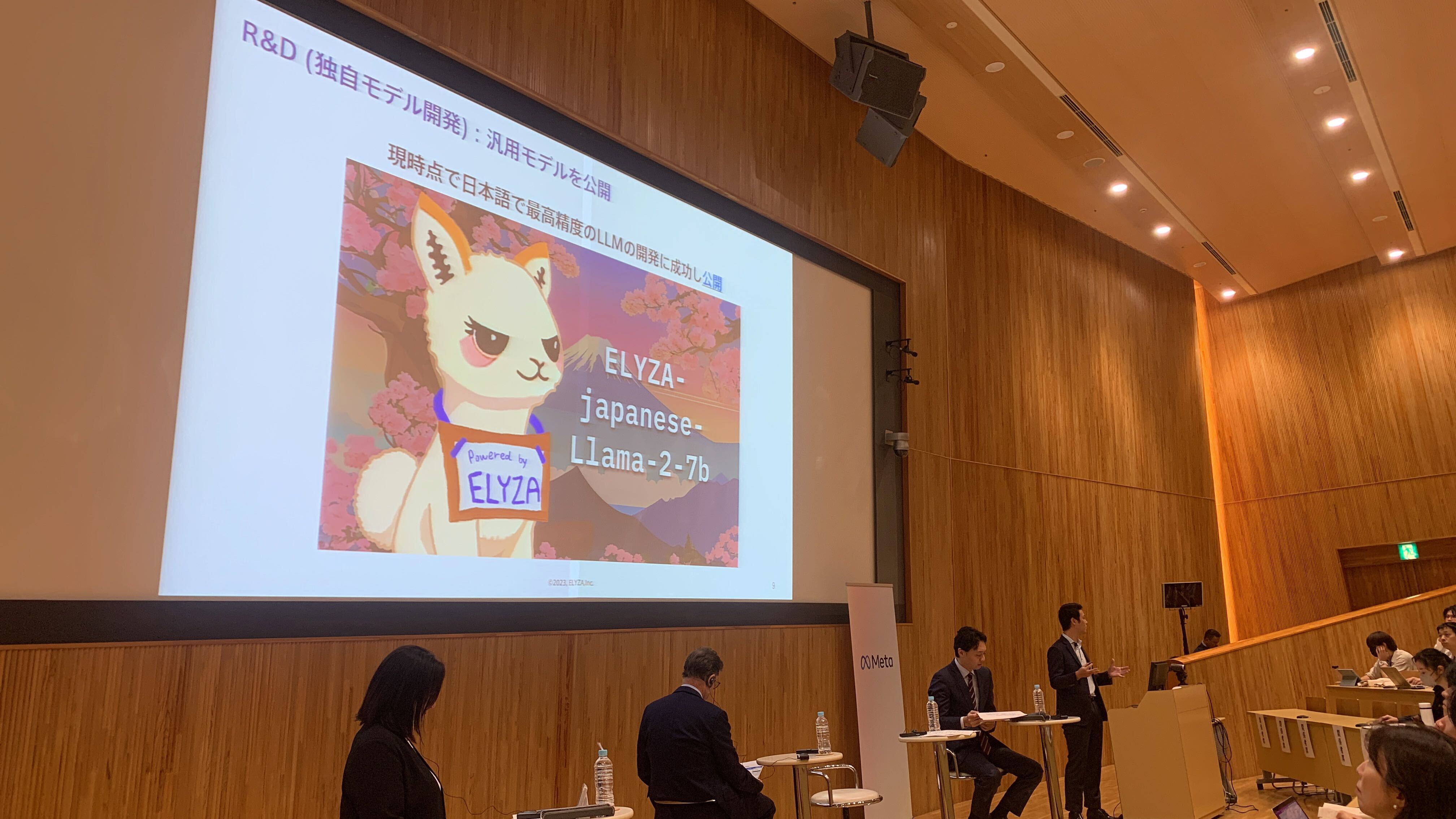 当日は大規模言語モデル開発の現状と、当社がMetaの「Llama 2」を基盤に開発した日本語LLM「ELYZA-japanese-Llama-2-7b」についての紹介を行ったほか、パネルディスカッションを通してNick Clegg氏や松尾豊教授と生成AIの未来ビジョンについて議論を交わしました。
